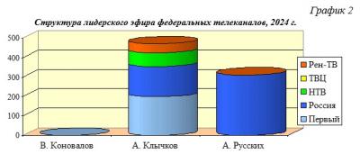 В октябре 2024 года на федеральных каналах упоминались А. Русских (трижды на прочих федеральных каналах) и А. Клычков (один раз). В.Коновалов в октябре не упоминался.