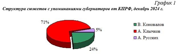 Таким образом, в декабре 2024 г. 71% сюжетов были посвящены А.Клычкову, 24% В. Коновалову и 5% А. Русских (Гр.1).