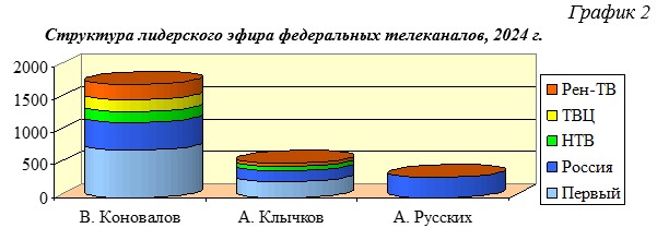 В декабре 2024 года на федеральных каналах упоминались А. Клычков (дважды на центральных каналах и 13 раз на прочих), В. Коновалов (пять раз на прочих федеральных каналах) и А. Русских (один раз на ОТР).