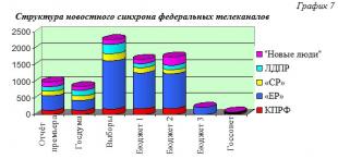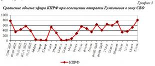 КПРФ было выделено 10,4% суммарного эфира при освещении первого чтения бюджета, 10,3% при освещении второго. Компартия не упоминалась при освещении третьего, т.е. доля КПРФ практически не менялась в первых чтениях. Несколько иное соотношение в синхроне. Так, комментариям от КПРФ телеканалы предоставили 11,2% синхрона в первом чтении проекта бюджета, 10,4% синхрона во втором чтении и 0% в третьем, т.е. доля партийцев снизилась.