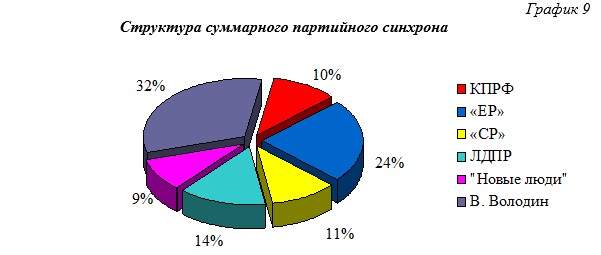 Таким образом, Г. Зюганову было выделено 34% синхрона (26 секунд), С. Миронову 25% (19 секунд), Л. Слуцкому 21% (16 секунд) и В. Васильеву – 20% (15 секунд). Партия «Новые люди» не упоминалась (гр. 12).