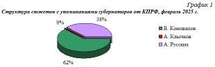 Таким образом, в феврале 2025 г. 62% сюжетов были посвящены В.Коновалову и 38% А.Русских (Гр.1).