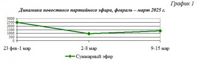В течение февраля – марта 2025 г. общий объём суммарного новостного партийного телеэфира изменялся следующим образом (Гр.1):