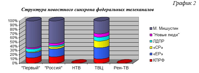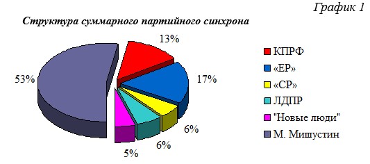 Что касается синхрона (прямой речи) партийцев, то его структура аналогична: наибольшую долю эфирного времени заняли отрывки из выступления М. Мишустина и его ответы на вопросы (53% или 19 минут 12 секунд синхрона). «Единороссам» было предоставлено 17% эфирного времени или 6 минут 18 секунд синхрона.