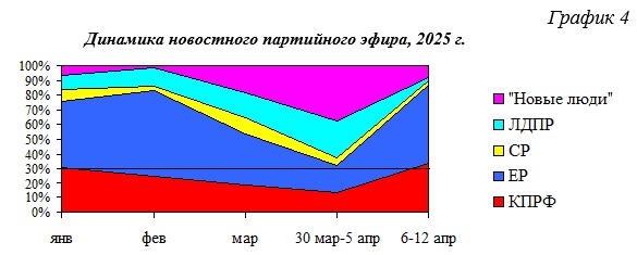 В течение 2025 г. структура новостного партийного телеэфира менялась следующим образом (Гр.4):
