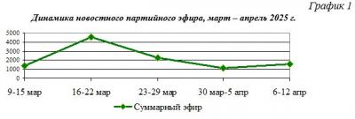 В течение марта – апреля 2025 г. общий объём суммарного новостного партийного телеэфира изменялся следующим образом (Гр.1):