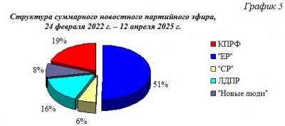 Всего в период с 24 февраля 2022 г. по 12 апреля 2025 г. суммарный политический эфир составил 115 часов 21 минута эфирного времени. При этом 51% эфира получила «Единая Россия», 19% КПРФ, 16% ЛДПР, 8% «Новые люди» и 6% «Справедливая Россия». Компартия заняла второе по освещению место в телеэфире.