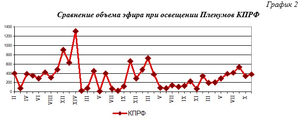 XII (апрельский) Пленум ЦК КПРФ освещался на 41 секунду дольше, чем X (октябрьский) Пленум, но в полтора раза меньше, чем IX (майский) Пленум. Таким образом, объём освещения Пленумов ЦК КПРФ несколько возрос.