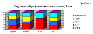 Таким образом, дольше всего маёвку КПРФ освещал «Россия» (63% или 2 минуты 51 секунду, из них 1 минуту 23 секунды заняла прямая речь участников мероприятия). ТВЦ выделил КПРФ 17% или 54 секунды эфира (из них 28 секунд пришлось на прямую речь), НТВ – 12% или 31 секунду (без предоставления синхрона), «Первый» - 8% или 22 секунды (из них 17 секунд заняло выступление Г. Зюганова).