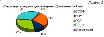 Что касается синхрона (прямой речи) партийцев, то его структура иная: Коммунистам было предоставлено 28% суммарного времени или 2 минуты 8 секунд синхрона, либерал-демократам – 32% или 2 минуты 23 секунды, «эсерам» - 30% эфира или 2 минуты 19 секунд, «единороссам» - 11% или 48 секунд прямой речи (Гр.2).