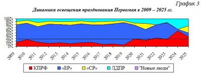 На графике 3 представлено сравнение освещения Первомая в последние годы, здесь эфирное время, выделенное митингам Профсоюзов в 2014 – 2025 гг., для удобства было прибавлено к времени «единороссов» в те годы, когда они шли одной колонной.