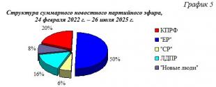 Всего в период с 24 февраля 2022 г. по 26 июля 2025 г. суммарный политический эфир составил 121 час 32 минуты эфирного времени. При этом 50% эфира получила «Единая Россия», 20% КПРФ, 16% ЛДПР, 8% «Новые люди» и 6% «Справедливая Россия». Компартия заняла второе по освещению место в телеэфире.