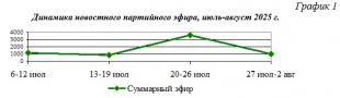 В течение июля-августа 2025 г. общий объём суммарного новостного партийного телеэфира изменялся следующим образом (Гр.1):