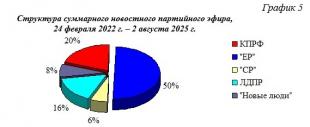 Всего в период с 24 февраля 2022 г. по 2 августа 2025 г. суммарный политический эфир составил 121 час 53 минуты эфирного времени. При этом 50% эфира получила «Единая Россия», 20% КПРФ, 16% ЛДПР, 8% «Новые люди» и 6% «Справедливая Россия». Компартия заняла второе по освещению место в телеэфире.