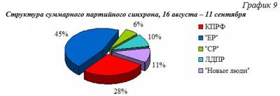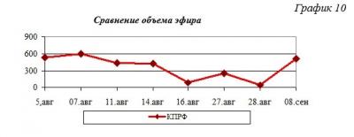 КПРФ: В период с января по сентябрь доля Компартии колебалась в промежутке от 19 до 47%. Наибольшую долю эфирного времени Компартия получила в мае и августе (45 и 47% соответственно), наименьшую – в марте (19%). Три месяца из восьми КПРФ обгоняла «ЕР» по объёму эфира. В мае рост эфира КПРФ был вызван освещением большого числа позитивных инфповодов (Первомая, День Пионерии, День Победы, отправка Гумконвоя), а также негативом при освещении аварии с участием Д. Дубовенко. В августе и сентябре при относительно небольшом суммарном объёме телеэфира освещалось много собственных инфоповодов Компартии (поездки и встречи Г. Зюганова, отправка Гумконвоев).