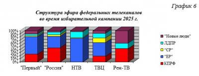 В сравнении с избирательной кампанией 2024 года доля КПРФ в 2025 году в месяц агитации упала с 32,8% до 26,3%. При этом в два раза упал и суммарный объём эфирного времени.