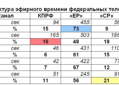 Коммунистической партии досталось 6 часов 37 минут 36 секунд общего партийного эфира, или 11%, что в 5 раз меньше, чем «Единой России», на треть меньше, чем «СР» и на 1/5 меньше, чем ЛДПР (График 2).