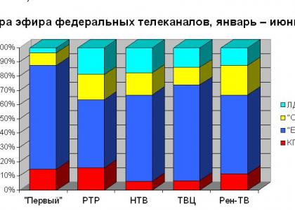 Рассмотрим распределение эфирного времени на пяти федеральных телеканалах (Таблица 2):