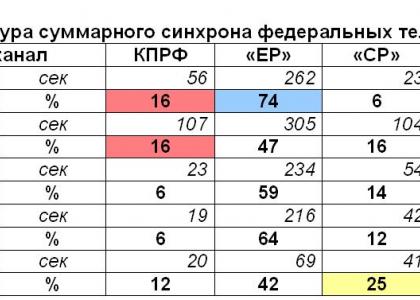 Максимальную долю суммарного синхрона предоставили коммунистам «Россия» и «Первый» (по 16%). Минимальную – ТВЦ и НТВ (по 6%).