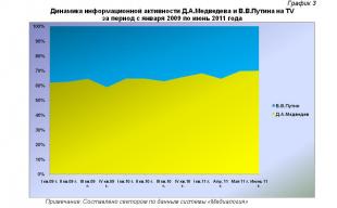 Количественнй анализ динамики информационной активности Д.А.Медведева и В.В.Путина на TV за период с I квартала 2009 по июнь 2011 года (график 3) позволяет заключить, что с IV квартала 2009 года явственно прослеживается тенденция на поступательное увеличение количества телевизионных сообщений, посвящённых деятельности президента и, как следствие, сокращение степени представленности на экранах премьера. Лишь изредка позиции президента немного ослабевают, что является следствием складывающейся в стране политической конъюнктуры, что, тем не менее, не становится основанием для лишения его лидирующего положения в телевизионном эфире.