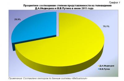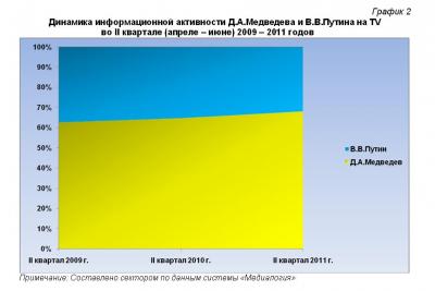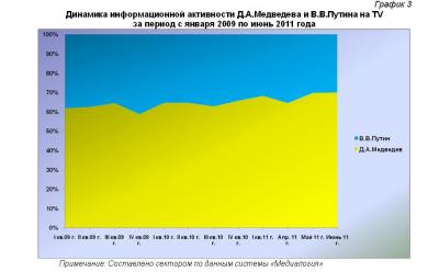 В июне 2011 г. число телевизионных сюжетов о деятельности Д.А.Медведева немного увеличилось: с майских 69,8% до 70,1%. Это, в свою очередь, на 1,5 % больше уровня того же периода прошлого года. Информационная активность В.В.Путина, соответственно, снизилась – с 30,2 до 29,9% против 31,4% годом ранее.