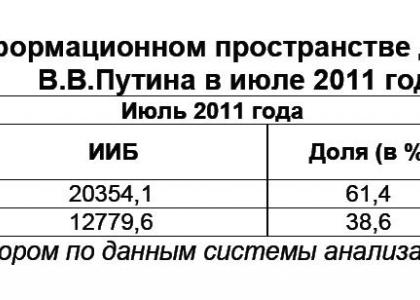 Согласно полученным данным, июль 2011 года ознаменовался снижением количества телевизионных сюжетов, посвящённых деятельности президента (с июньских 70,1% и с 68,1% за II квартал 2011 г. до 66,9%). И расширением пространства телевизионного поля, отведённого председателю российского правительства (33,1% против 29,9% в июне и 31,9% в апреле – июне текущего года) (график 1).