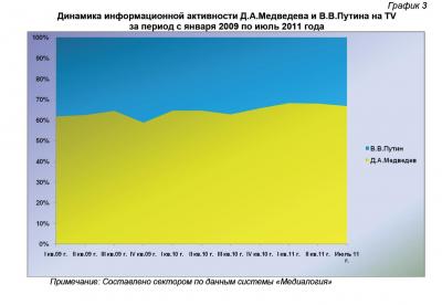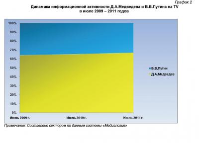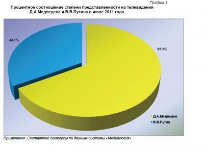 Согласно полученным данным, июль 2011 года ознаменовался снижением количества телевизионных сюжетов, посвящённых деятельности президента (с июньских 70,1% и с 68,1% за II квартал 2011 г. до 66,9%). И расширением пространства телевизионного поля, отведённого председателю российского правительства (33,1% против 29,9% в июне и 31,9% в апреле – июне текущего года) (график 1).
