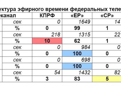 Только два телеканала выделили эфирное временя Компартии: «Россия» и Рен-ТВ (10 и 3%). Остальные телеканалы КПРФ проигнорировали.
