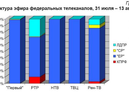 За период с 31 июля по 13 августа на пяти федеральных телеканалах четырём парламентским партиям было посвящено 1 час 59 минут 44 секунды новостного партийного эфира (Таблица 1).