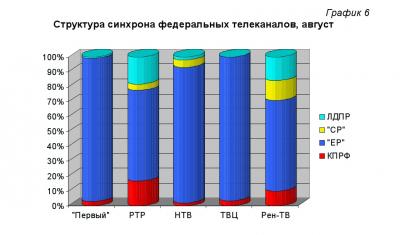 В августе на пяти федеральных телеканалах четырём парламентским партиям было посвящено 6 часов 10 минут 48 секунд новостного партийного эфира (Таблица 1).