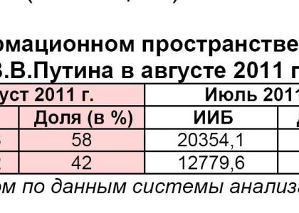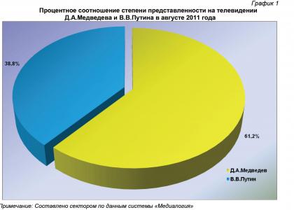 Согласно полученным данным, август 2011 года ознаменовался дальнейшим снижением количества телевизионных сюжетов, посвящённых деятельности президента (с июньских 70,1%, июльских 66,9% до 61,2%). И расширением пространства телевизионного поля, отведённого председателю российского правительства (38,8% против 33,1% в июле и 29,9% в июне текущего года) (график 1).