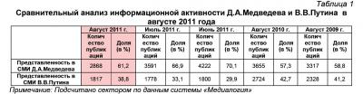 Однако, как бы ни старались пиар-менеджеры В.В.Путина обеспечить его непревзойдённость по отношению к «преемнику», число упоминаний о деятельности нынешнего президента РФ в значительной степени превышает медиа-активность премьер-министра.