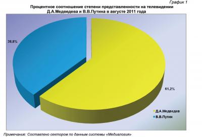 Согласно полученным данным, август 2011 года ознаменовался дальнейшим снижением количества телевизионных сюжетов, посвящённых деятельности президента (с июньских 70,1%, июльских 66,9% до 61,2%). И расширением пространства телевизионного поля, отведённого председателю российского правительства (38,8% против 33,1% в июле и 29,9% в июне текущего года) (график 1).