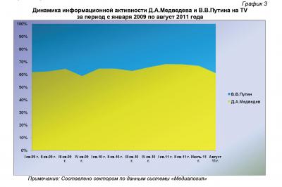 Количественный анализ динамики информационной активности Д.А.Медведева и В.В.Путина на TV за период с I квартала 2009 по август 2011 года (график 3) позволяет заключить, что с IV квартала 2009 года явственно прослеживается тенденция на поступательное увеличение количества телевизионных сообщений, посвящённых деятельности президента и, как следствие, сокращение степени представленности на экранах премьера. Лишь изредка позиции президента немного ослабевают, что является следствием складывающейся в стране политической конъюнктуры, что, тем не менее, не становится основанием для лишения его лидирующего положения в телевизионном эфире.