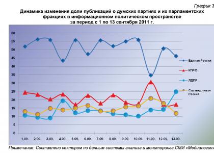 Анализ динамики доли публикаций о фракциях парламентских партий за 1 – 13 сентября 2011 года (график 2) позволяет заключить, что на 13 сентября пришёлся максимальный за рассматриваемый период процент упоминаний думских либерал-демократов, минимальный – эсеров и стремящийся к минимуму – коммунистов и единороссов.