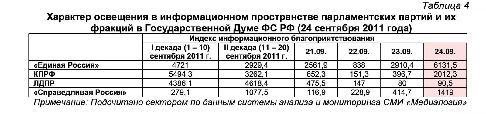 24 сентября 2011 г. в информационном пространстве отмечалось 418 публикаций о партии «Единая Россия» или 54,4% от общего числа высказываний, озвученных в адрес парламентских партий. В 168 материалах (21,9%) фигурировала КПРФ, в 140 (18,2%) – «Справедливая Россия», а в 42 (5,5%) – ЛДПР.
