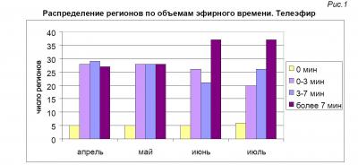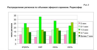 В 16 регионах о деятельности Компартии рассказывалось менее минуты за весь месяц. Ещё 22 региональных ГТРК освещали её работу в течение 1-3 минут, и 26 ГТРК – в течение 3-7 минут (рис.3). Таким образом, в зоне вещания двух третей российских ГТРК представители Компартии получили в июле меньше времени, чем предоставлялось прежде в обязательном порядке для отчёта одного депутата Госдумы.