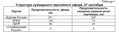 27 сентября на пяти федеральных телеканалах четырём парламентским партиям было посвящено 12 минут 53 секунды новостного партийного эфира (Таблица 1).