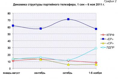 Однако указанное соотношение отражает лишь усреднённую картину. В отдельные дни и периоды неравенство значительно больше. Так, 1 ноября 2011 года «Единой России» было отведено 93% эфирного времени (1 час 24 минуты). ЛДПР досталось 3%, или 3 мин 10 сек. На долю Компартии пришлось только 2% эфира (2 минуты 3 секунда). «Справедливая Россия» получила 83 секунды эфирного времени.