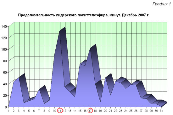 Лидерский телеэфир значительно отличался по продолжительности в различные периоды последнего месяца прошлого года (График 1). Так, послевыборный всплеск с максимальной суточной продолжительностью 50 минут быстро иссяк, и объём телевизионной информации о шести лидерах достиг локального минимума в 8 минут за сутки.