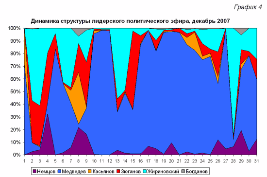 В.В.Жириновский получал значительную долю эфира четыре раза за декабрь. Это обсуждение итогов парламентских выборов; съезд ЛДПР, а также активное участие в политических проектах телевидения (программа «Народ хочет знать») на фоне повышенного плюрализма до выдвижения преемника и снижения активности в его пиаре в предпраздничные дни.