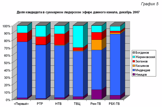 За декабрь 2007 года на общефедеральных телеканалах в выпусках новостей и информационно-аналитических программах вышло всего 1339 сообщений с упоминанием о шести кандидатах в президенты, то есть в среднем 43 сообщения в день. Это в 1,7 раз больше, чем сообщений с упоминанием хотя бы одной из 11 партий, участвовавших в думской избирательной кампании, в период самой активной агитации – в ноябре месяце. Тот факт, что федеральные телеканалы за два месяца до дня голосования уделяли в 1,5-2 раза больше внимания политике (и кандидатам в президенты в частности) чем партиям – непосредственно перед парламентскими выборами, говорит о большей значимости президентских выборов по сравнению с парламентскими – для тех, кто принимает решения по контенту телеэфира. Вероятно, присутствует неуверенность в «сокрушительности» победы кандидата от партии власти, а «параметры» его победы на президентских выборах играют для правящей группировки весьма существенную роль.